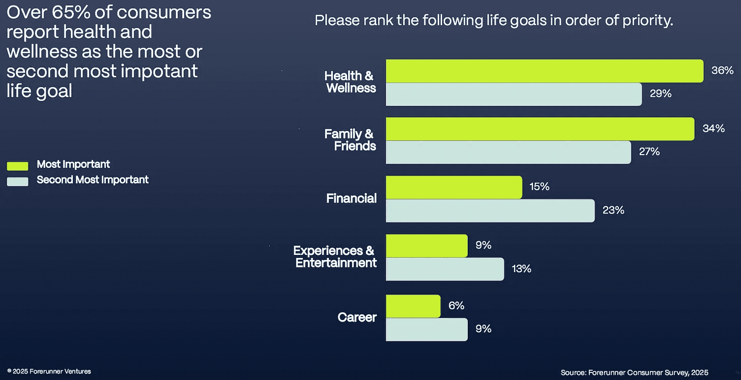 As a result, consumers are taking far greater control of their well-being. For many, it has become their top priority. Forerunner’s 2025 Annual Trend Report highlighted Health & Wellness as the number one life goal for consumers — ranking even higher than family, friends, or finances.